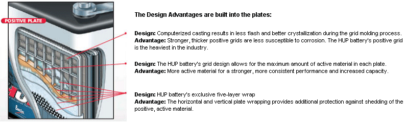 HUP battery plates significantly reduce flaking and shedding of positive plate materials. The design of the HUP battery's positive plate grid allows for the maximum amount of lead paste to be locked into place during a controlled curing process. So the lead paste remains cohesive, and in contact with the positive grid far longer than in standard batteries.