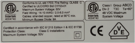 | Listed to UL 1703 & ULC ORD-C1703 Standard for Safety by Intertek ETL. Class C Fire Rating. | ||