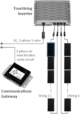 HiQ TrueString inverter systems utilize the Hi-Q GW-A Communications Gateway (far right). While HiQ Solar inverters can operate without one, a wealth of monitoring and control becomes available when a HiQ Communications Gateway is added to the system. It communicates with local inverters over the power line by being plugged into one phase, and uses a proprietary communication method that is robust and reliable. Instigating auto-discover on the device will cause it to quickly search out newly added inverters and report back.