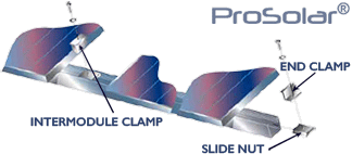 The clamping system consists of end clamps and mid clamps to attach the module frame to the Roof Trac support rail. This fully integrated clamping system actually changes the structural properties of the aluminum channel making it significantly stronger. This design allows solar modules to be installed at a lower profile to the roof, providing a more aesthetically pleasing installation. Module clamps are specifically designed, extruded and engineered for each specific module frame. ProSolar's innovative clamping system provides inward tension on the module frame securing the laminate in the frame. Channel nuts slide easily into position to hold the end clamps and mid clamps.